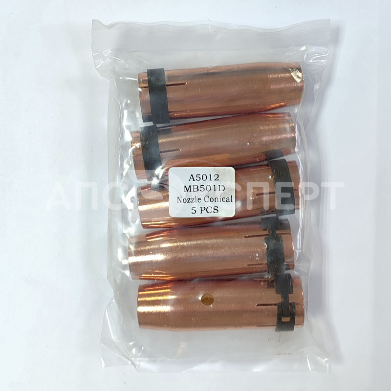 Сопло для MB-501 устанавливается на сварочную горелку и служит для равномерного распределения защитного газа при сварке и для защиты сварочного наконечника от случайного соприкосновения со свариваемой деталью. Используется в сварочных горелках серии MB-501D и ее аналогов. Материал изготовления - медь.